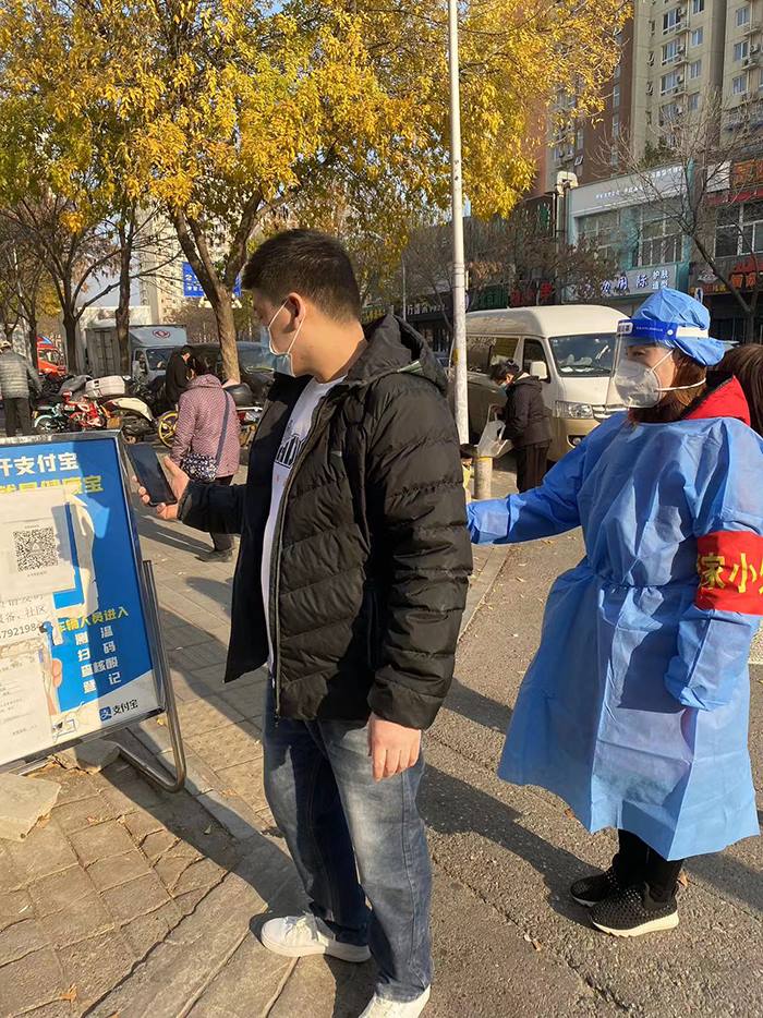 北京机扫公司职工张淼在平乐园西社区潘道庙小区对居家隔离户进行巡查服务